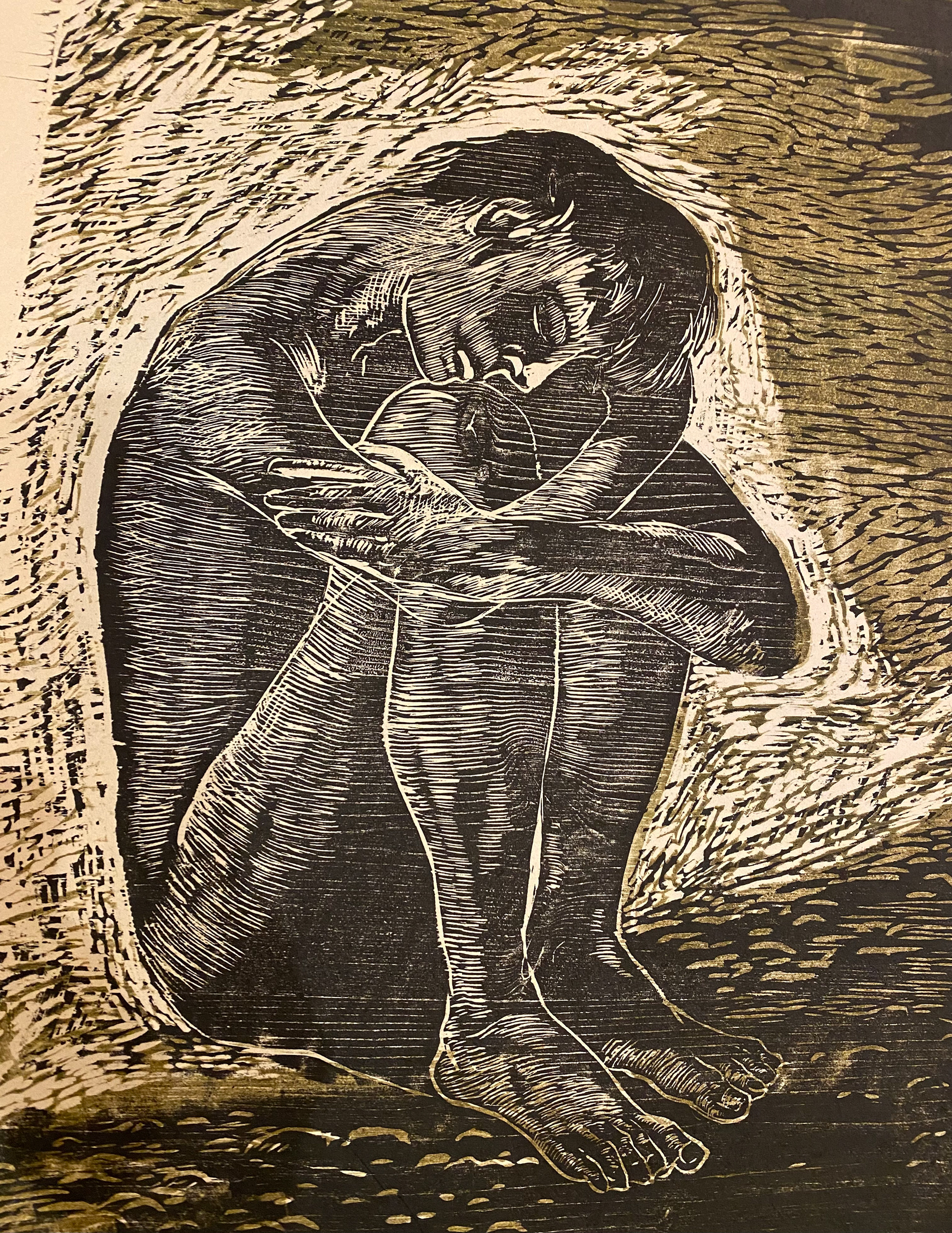 Dargestellt ist eine kauernde, nackte menschliche Figur, die sich selbst umschlingt. Die Haltung ist geschlossen, fast schützend, Arme um die Knie gezogen, Kopf gesenkt